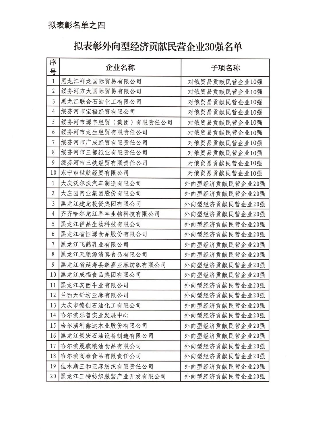 按照省委省政府關(guān)于召開全省民營(yíng)經(jīng)濟(jì)大會(huì)的決策部署要求,擬對(duì)全省優(yōu)秀民營(yíng)企業(yè)進(jìn)行表彰。經(jīng)企業(yè)自愿申報(bào)、市(地)把關(guān)推薦,評(píng)審小組排名,征求相關(guān)部門意見等程序,擬表彰全省累計(jì)納稅民營(yíng)企業(yè)50戶、就業(yè)突出貢獻(xiàn)民營(yíng)企業(yè)20戶、民營(yíng)高新技術(shù)企業(yè)50戶、外向型經(jīng)濟(jì)貢獻(xiàn)民營(yíng)企業(yè)30戶、龍江質(zhì)量品牌優(yōu)秀民營(yíng)企業(yè)50戶、生物經(jīng)濟(jì)民營(yíng)企業(yè)20戶和數(shù)字經(jīng)濟(jì)民營(yíng)企業(yè)20戶。現(xiàn)將擬表彰名單予以公示。